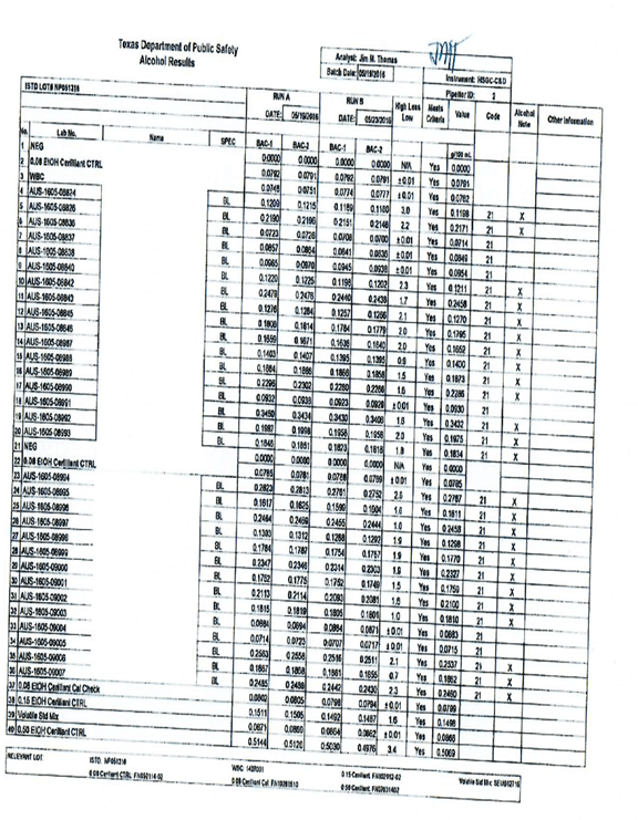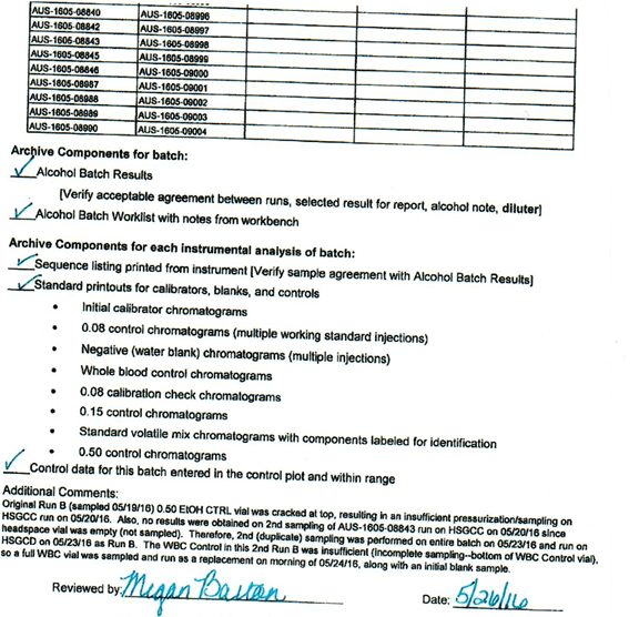In that frightening chart with your .24 blood test result, in the slot for the .08 control, the result from Tuesday (5/24/16) was substituted for the number that the Monday (5/23/16) .04 control should have measured, in order to make it appear that the proper amount was tested in the Monday batch. Of course, now we know this data comes from Tuesday after the batch test was run. The documents showing the erroneous .04 result were placed at the end of the long file.