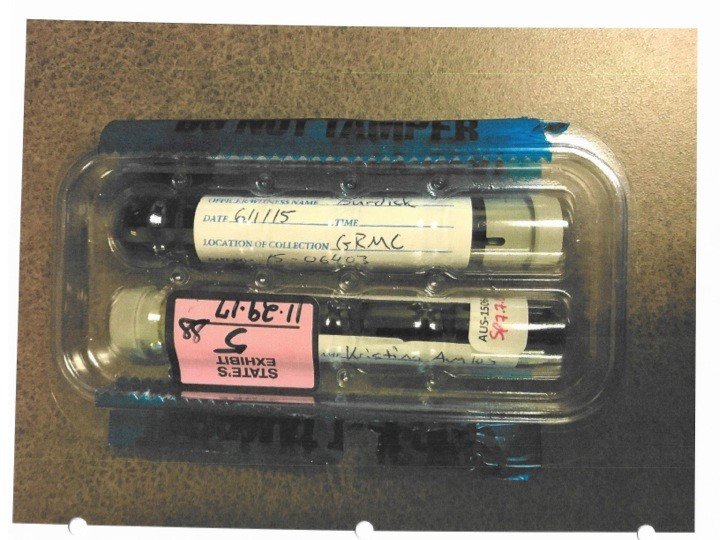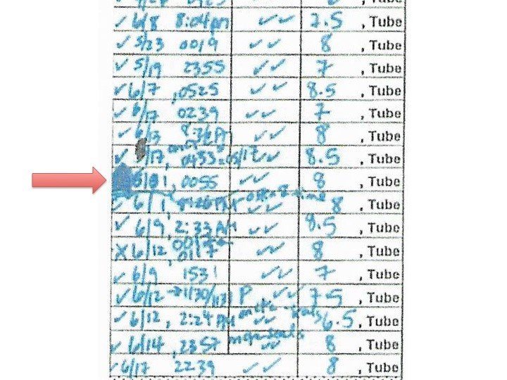 The date and time of the blood tube containing the defendant’s blood draw was clearly written on the blood tube, and the bench notes indicate which line that blood was assigned to. The arrow, of course, shows the line that defendant’s blood was assigned to. This is the defendant’s blood tube: