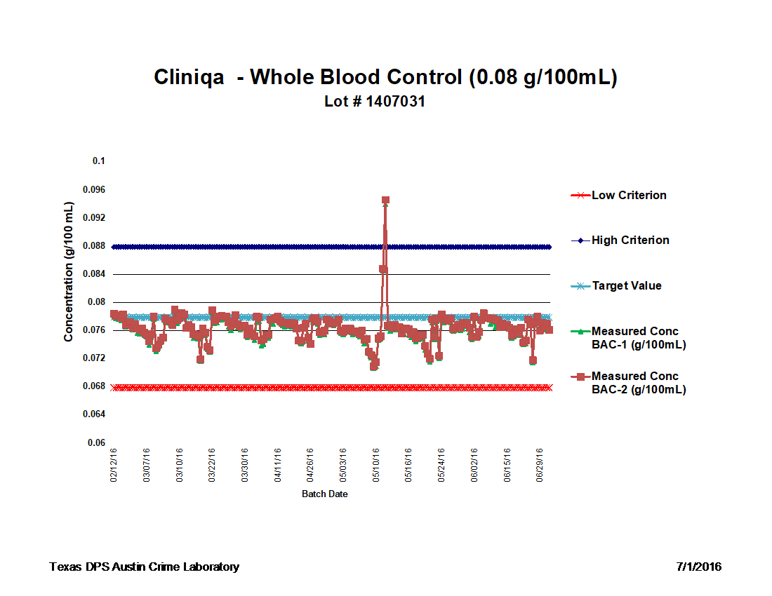 Wrong! In a DUI/DWI case this .08 is the magic number. So what went wrong for those 50 people? Was the NIST control wrong? Or, was it the testing process itself that NIST is trying to “control” that went wrong? Well, take a look. This high (“out of control”) reading didn’t just happen at once. If you look carefully, there are other squares leading to it that seem to be headed in a direction that is different from the regular cadence of control measurements. This problem happened over a period of time during which these automated processes were ongoing.